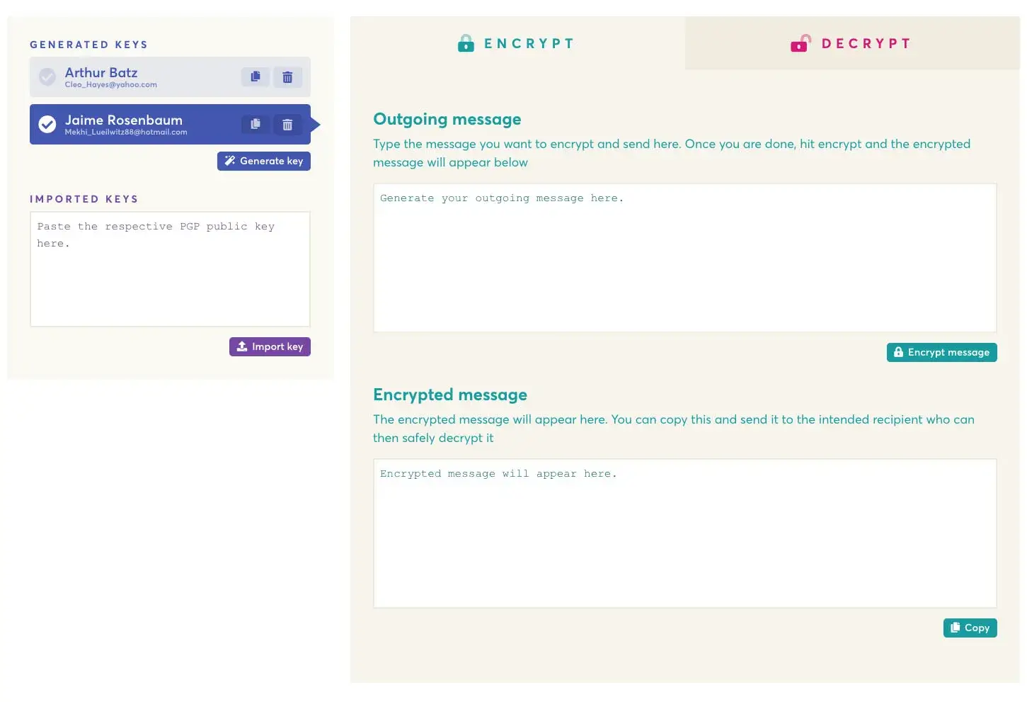 EncryptEasy é uma ferramenta simples e fácil de usar de criptografia PGP, gerenciando todas as suas chaves de contato e suas chaves. A criptografia deve ser simples. Desenvolvido com Wails.